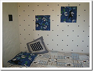 Med hjälp av hammare spikades sedan upphängning på plats och nu sitter de där på väggen. Tyget räckte även till ett kuddfodral som blev uppskattat. Så nu hoppas jag att han somnar i sin säng om en stund.